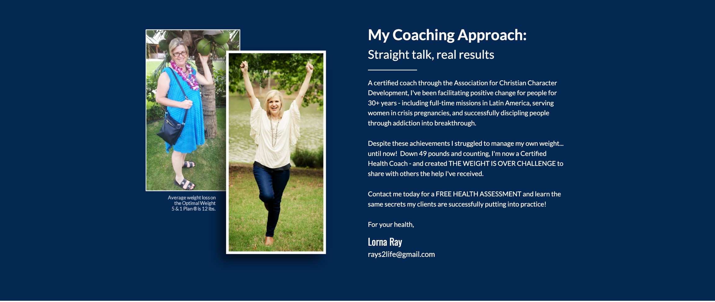 Despite these achievements I struggled to manage my own weight... until now! Down 49 pounds and counting, I'm now a Certified Health Coach - and created THE WEIGHT IS OVER CHALLENGE to share with others the help I've received.